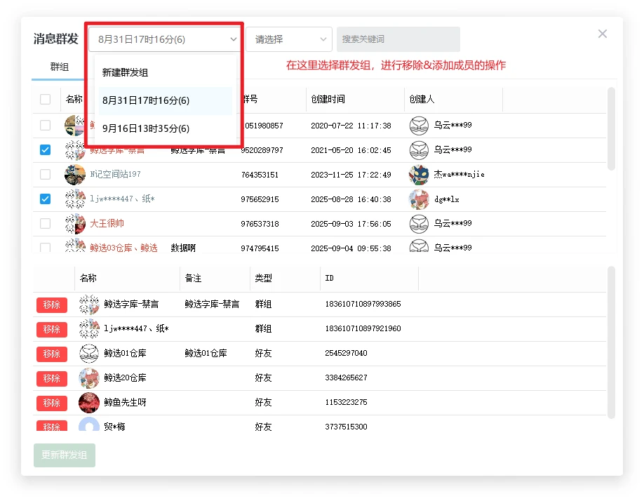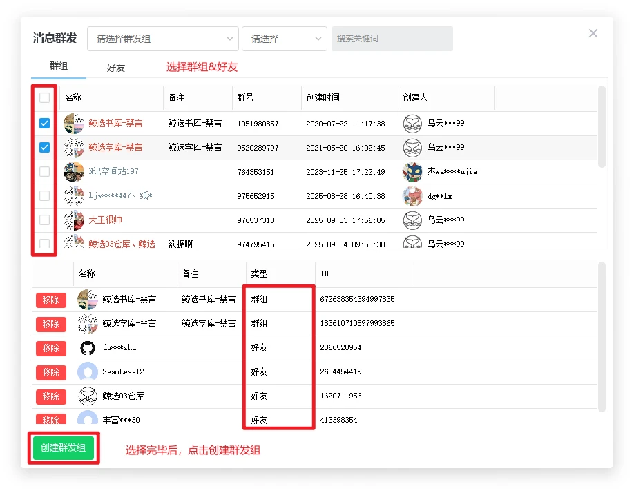 第二步、选择群组&好友创建群发组