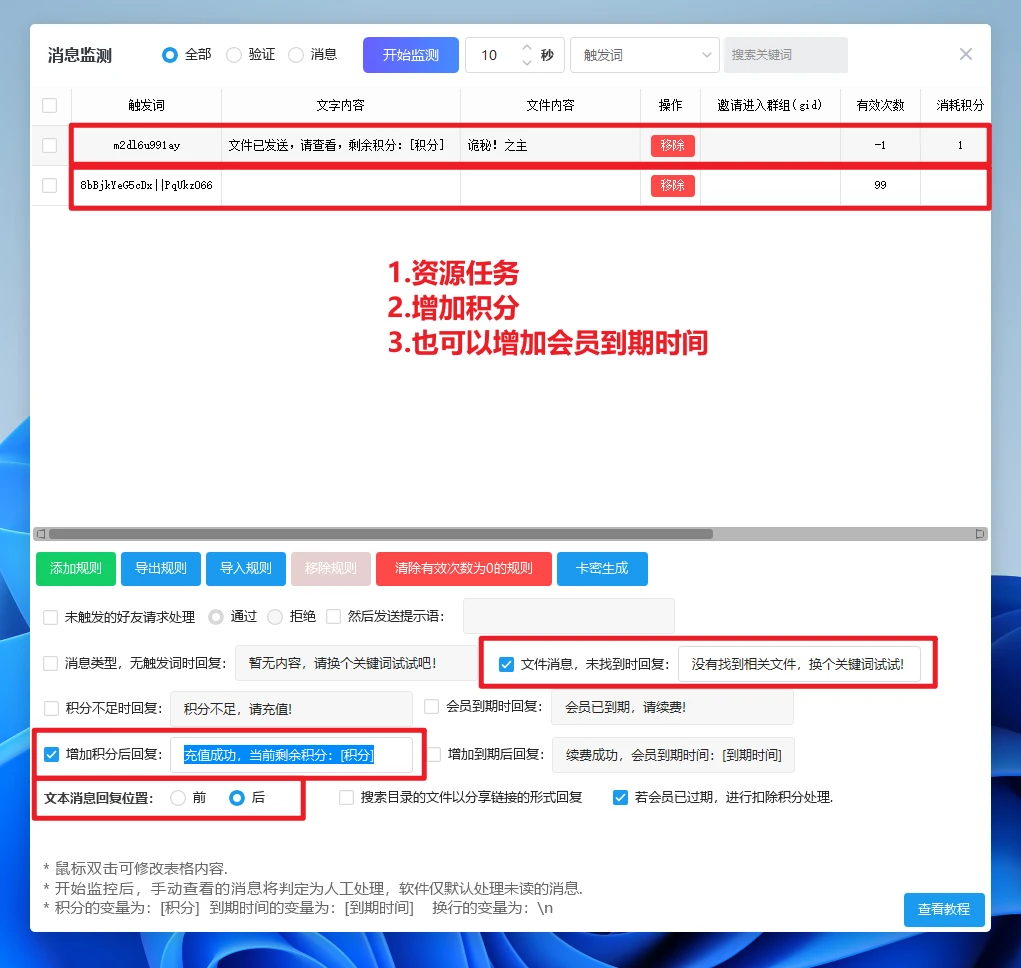 一条是 增加积分或是会员,创建了100条卡密,每次触发后,增加对应积分,并删除已触发的卡密.